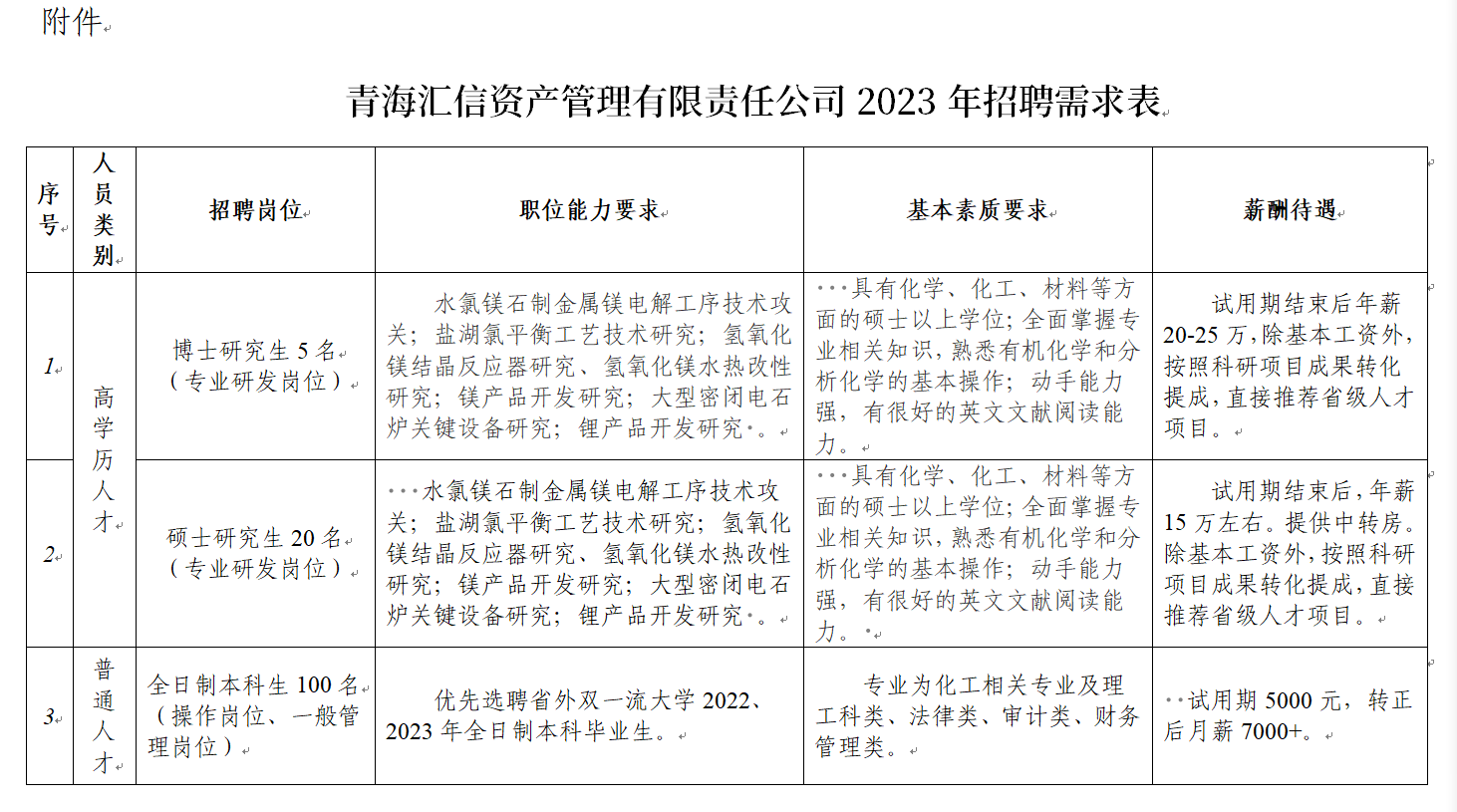 按照世界级盐湖产业发展基地建设需要和公司发展规划,计划面向社会招聘以下各类人才,具体如下: